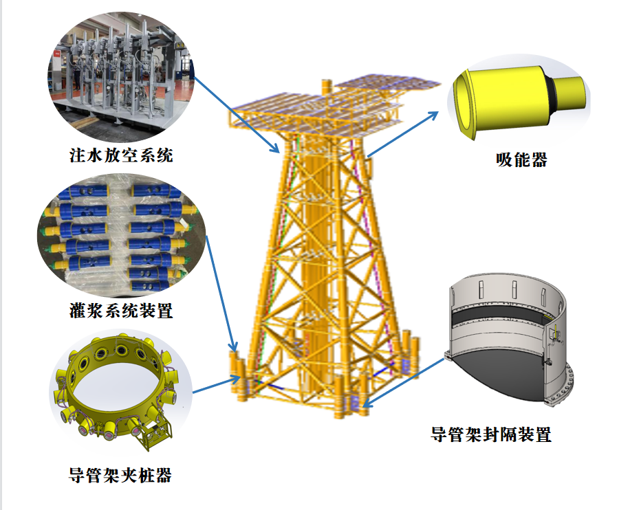 导管架安装核心专用工机具包括夹桩器、封隔器、灌浆系统、注水与放空系统、吸能器5类产品,长期以来面临断供的风险。近二十年,通过“导管架附属装置国产化研制”等6项集团公司及公司级科研课题的研发攻关及2项孵化项目的成功孵化,公司实践了科技创新的全流程机制,实现整套导管架核心工机具100%国产化,在产品功能、质量、供货周期等综合能力方面达到国际领先水平。