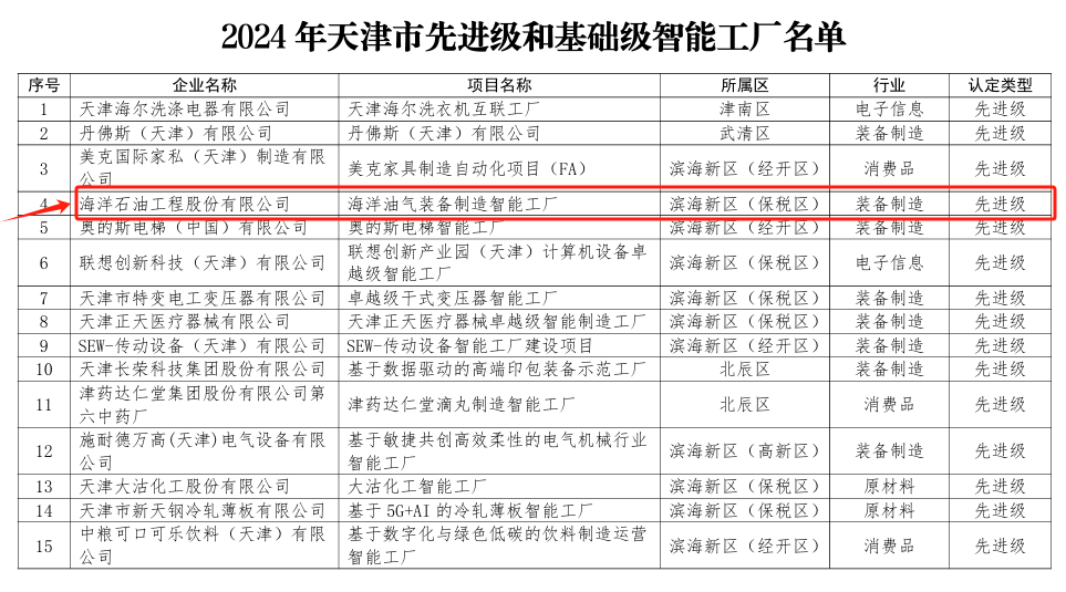 近年来,天津智能制造基地锚定公司战略规划,坚决落实智能化数字化转型要求,致力打造集海洋工程智能制造、油气田运维智慧保障以及海工技术创新研发平台等为一体的综合性基地,获评工业和信息化部等五部门2023年度智能制造示范工厂揭榜单位、国资委2023年国有企业数字化转型试点企业、工信部“2023年5G工厂”等称号。