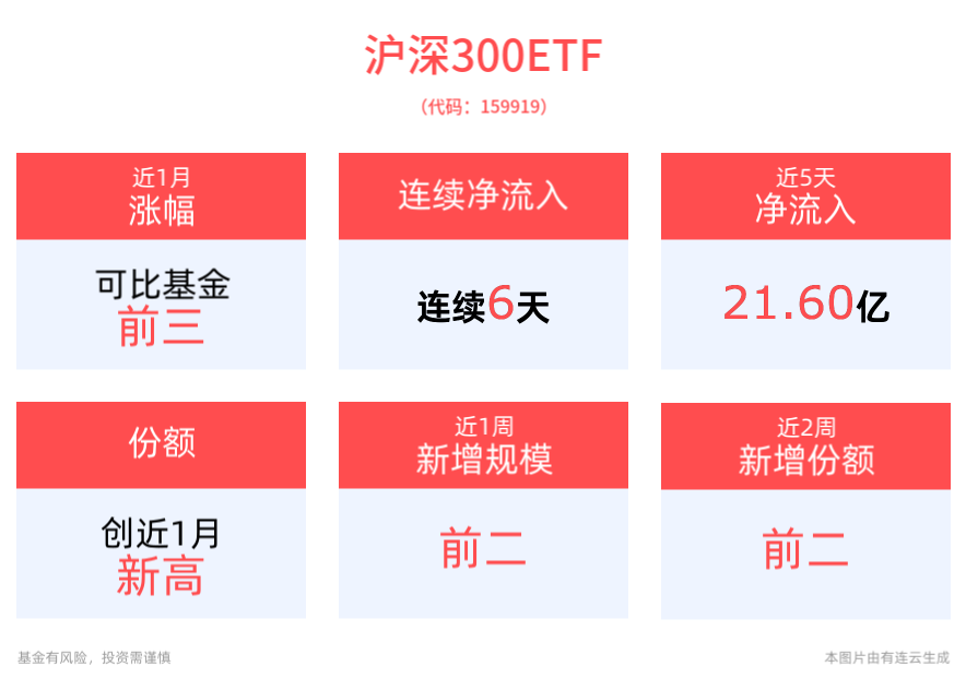 从资金净流入方面来看,沪深300ETF近6天获得连续资金净流入,最高单日获得7.24亿元净流入,合计“吸金”26.45亿元。