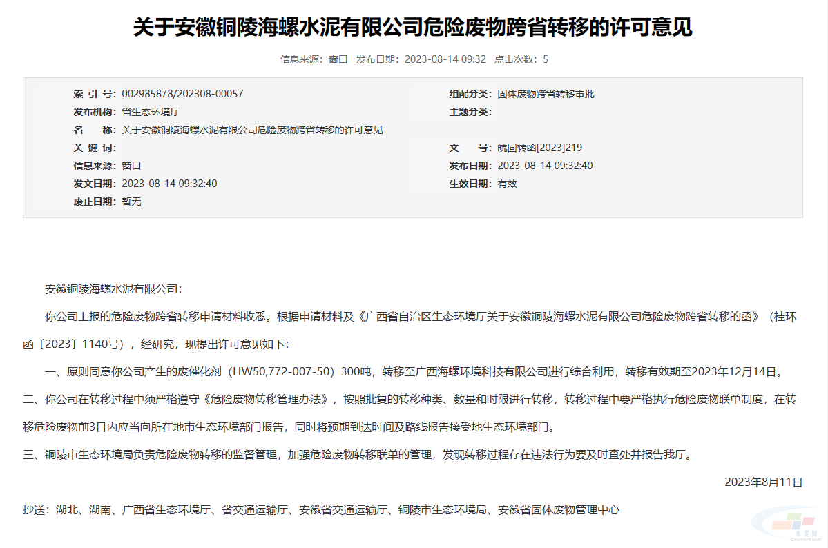 8月14日,安徽省生态环境厅发布了《关于安徽铜陵海螺水泥有限公司危险废物跨省转移的许可意见》,同意安徽铜陵海螺水泥有限公司将产生的300吨废催化剂(HW50,772-007-50),转移至广西海螺环境科技有限公司进行综合利用,转移有效期至2023年12月14日。