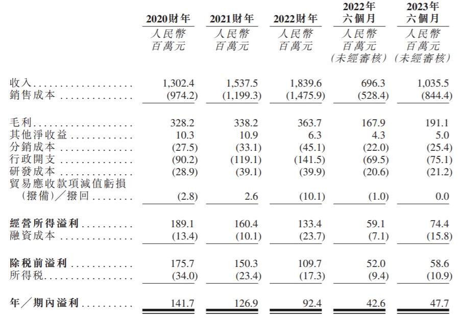 财务方面,于2020财年、2021财年、2022财年以及2023年六个月,海螺材料科技实现收入分别约为13.02亿元、15.38亿元、18.40亿元以及10.36亿元人民币;同期,年内溢利分别约为1.42亿元、1.27亿元、9240万元以及4770万元人民币。