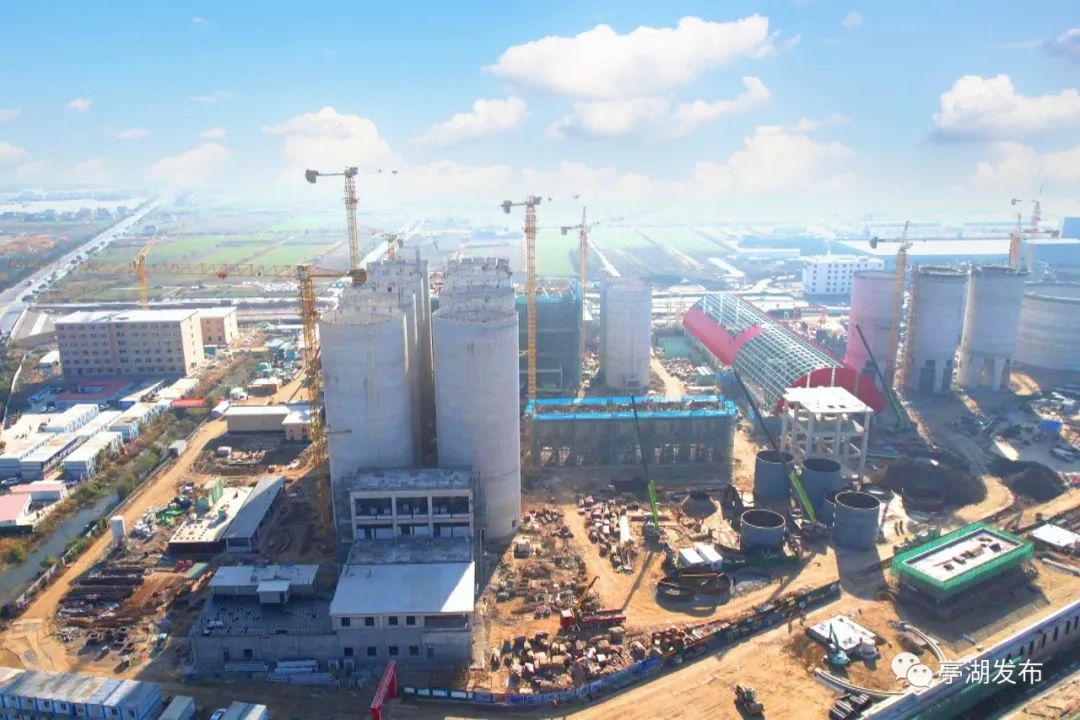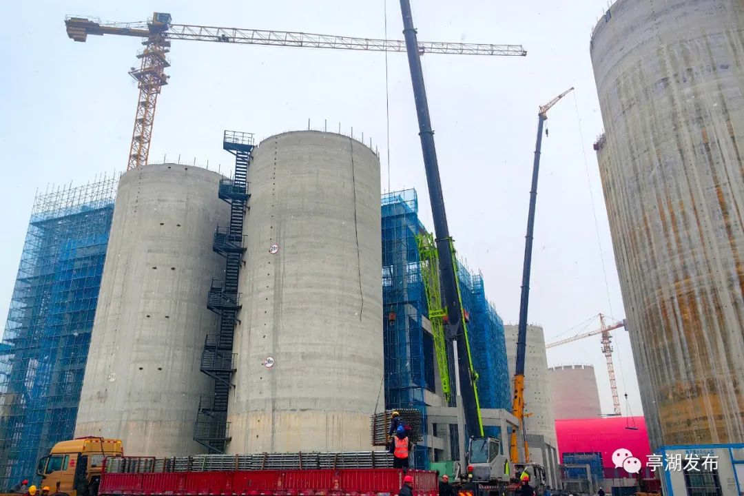 2023年12月18日下午,漫天雪花在呼啸寒风中四处翻飞。记者走进紧邻新洋港的八菱海螺低碳示范工厂项目建设现场,只见厂区内塔吊林立、机器轰鸣,各类建筑材料随着吊装设备准确转运,车辆来往穿行,工人们坚守项目建设一线,在各自工位上绑扎钢筋、切割钢板、搬运建材、安装设备,尽是一派“大干四季度”的忙碌景象。