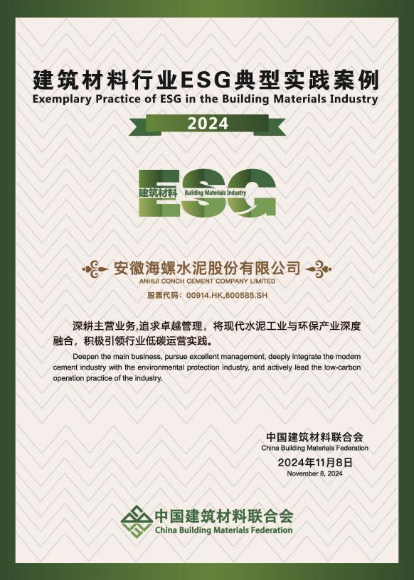 11月13至14日,中国建筑材料联合会在北京召开2024年度建筑材料行业大会,会上发布了中国建筑材料行业ESG发展研究报告(2024)及典型案例,海螺水泥凭借在ESG方面的卓越实践,成功入选“2024年度建筑材料行业ESG典型实践案例”。
