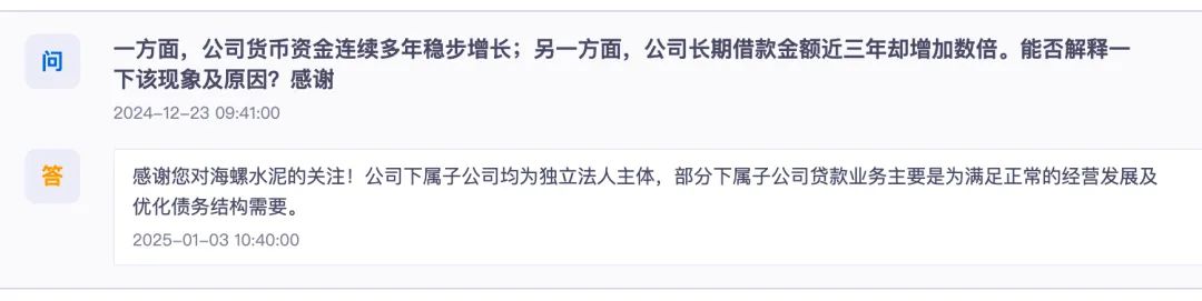 面对投资者的疑问,海螺水泥回应称,公司下属子公司均为独立法人主体,部分下属子公司贷款业务主要是为满足正常的经营发展及优化债务结构需要。
