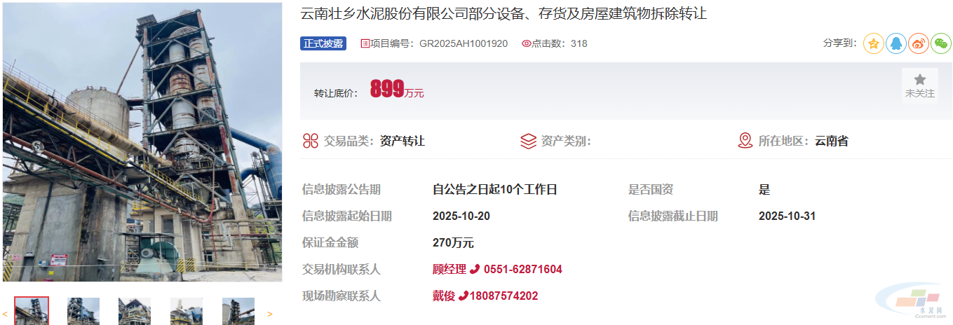 近日,据某产权交易平台信息显示,云南壮乡水泥股份有限公司部分设备、存货及房屋建筑物拆除转让,挂牌价格为899万元。