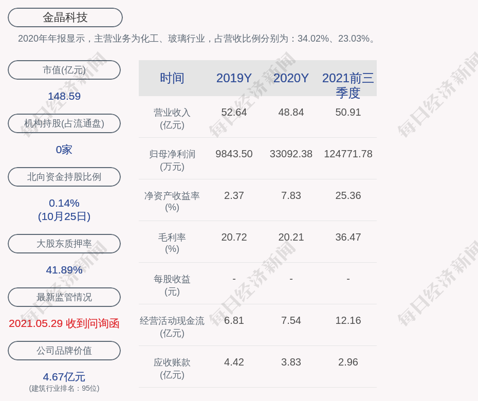 2020年年报显示,金晶科技的主营业务为化工、玻璃行业,占营收比例分别为:34.02%、23.03%。