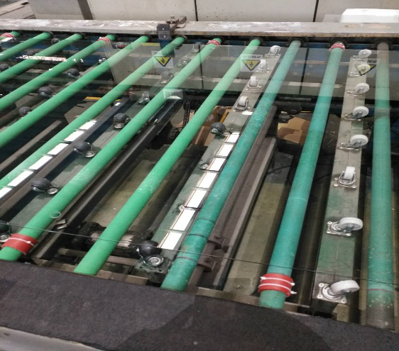然后就是玻璃传送到钢化炉上片台后,位置跑偏的问题,如果玻璃位置不正,在玻璃进入炉膛再到出炉进入到风栅后,极有可能会超出风栅范围,导致玻璃颗粒超标,也会大幅提高玻璃自爆率和客户投诉。为了解决这个问题,攻关小组在上片台辊道上加装了几个简单的定位挡块,100%消除了跑偏的风险。