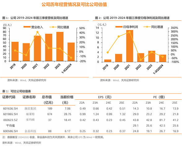 公司前三季度整体毛利率17.87%,同比下滑0.29pct,其中Q3单季度毛利率12.64%,同比/环比分别下滑7.82/5.54pct。Q3公司整体费用率10.0%,同比+0.3pct,其中销售/管理/研发/财务费用率同比分别-0.02/-0.60/+0.74/+0.25pct,费用端整体相对稳定,最终实现Q3扣非归母净利率1.5%,同比/环比-6.6/-4.0pct。期待TCO放量,维持“买入”评级公司具备纯碱-玻璃产业链一体化优势,通过产品结构调整,不断增强盈利能力,随着国内钙钛矿产业化推进以及海外客户业务合作的推动,TCO玻璃有望逐步放量,我们继续看好公司中长期成长性。考虑到玻璃及纯碱价格下降,下调公司24-26年归母净利润预测3.3/5.2/6.6亿元(前值5.0/7.0/8.6亿元),参考可比公司,给予25年24倍目标PE,对应目标价8.77元,维持“买入”评级。