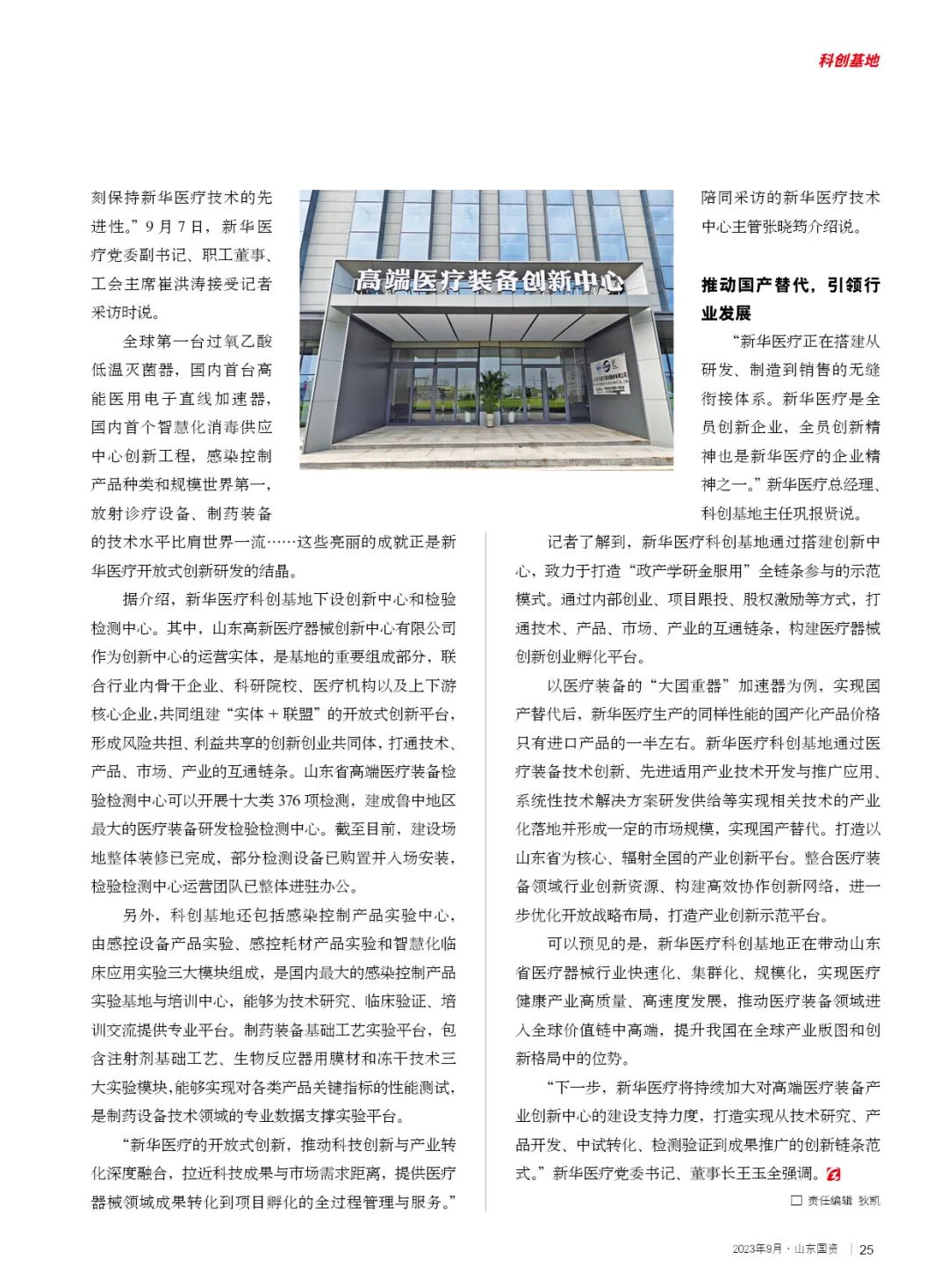 “新华医疗科创基地建设依托公司省医疗器械产业链‘链主’企业的行业龙头地位,以山东省高端医疗器械产业创新中心建设和山东国资科创基地建设为契机,加强检验检测试验条件,构建面向整个医疗器械行业的创新网络,构建产业创新生态系统。”杨金彬说。