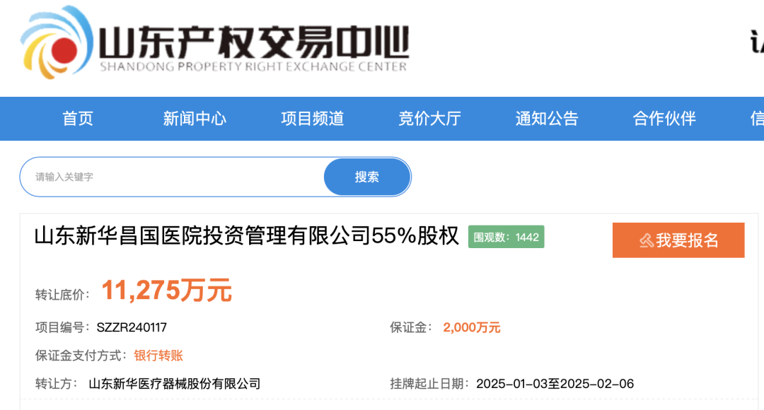 近日,山东产权交易中心发布一则消息,新华医疗挂牌转让旗下控股的山东新华昌国医院投资管理有限公司55%股权,转让底价约1.13亿元。