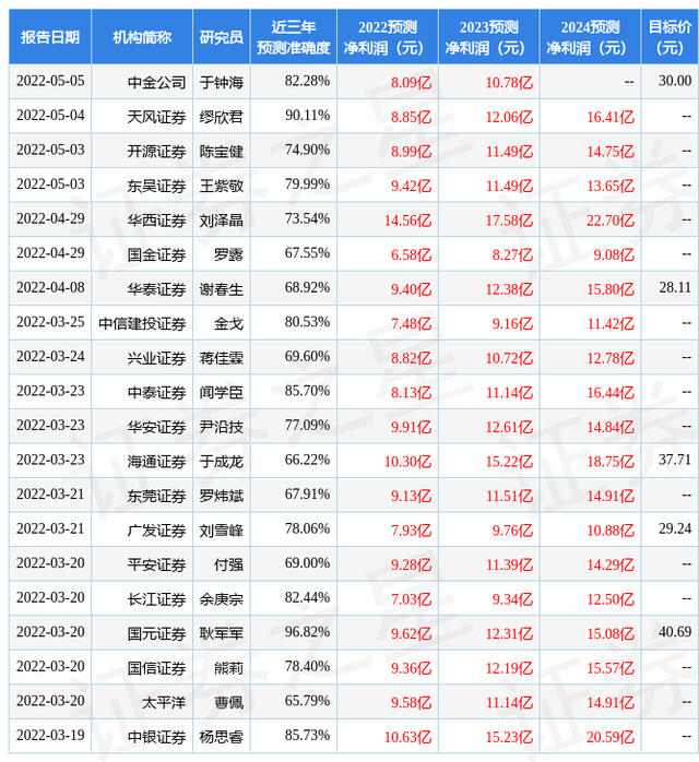 证券之星数据中心根据近三年发布的研报数据计算,国元证券耿军军研究员团队对该股研究较为深入,近三年预测准确度均值高达96.82%,其预测2022年度归属净利润为盈利9.62亿,根据现价换算的预测PE为66。
