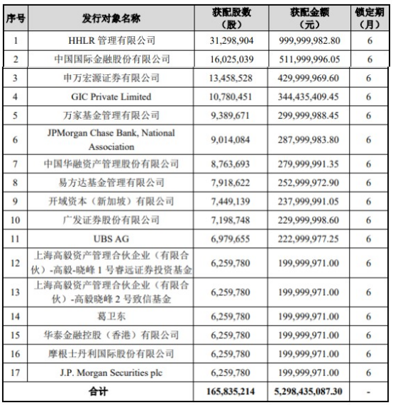 根据公告,这笔定增最终确定17名发行对象,不少知名机构获配股份。其中,高瓴旗下的HHLR管理有限公司获配股份最多,共3129.89万股,获配约10亿元。