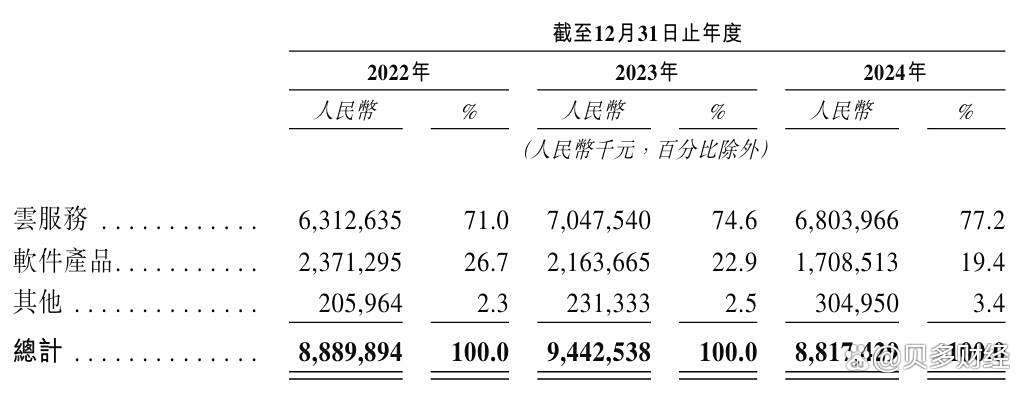 用友网络的云服务主要包括用友BIP系列产品、U9 cloud、畅捷通提供的产品及行业特定解决方案。2022年、2023年和2024年,该公司云服务收入贡献分别为71.0%、74.6%和77.2%,是其主要收入来源。