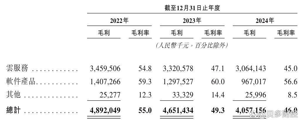 不仅如此,用友网络的毛利水平也有所倒退,报告期内的毛利润分别为48.92亿元、46.51亿元和40.57亿元;毛利率连续两年出现下滑,由2022年的55.0%一路走低,到2024年毛利率仅剩46.0%。