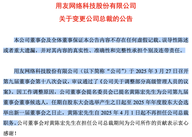 业绩承压之下,用友网络创始人王文京重回一线,担任公司总裁一职。据公司3月29日公告显示,因工作调整原因,黄陈宏自2025年4月1日起不再担任公司总裁职务。同时,公司决定聘任董事长王文京兼任公司总裁,任期自2025年4月1日至公司2025年年度股东大会选举出新一届董事会并聘任公司高级管理人员之日止。