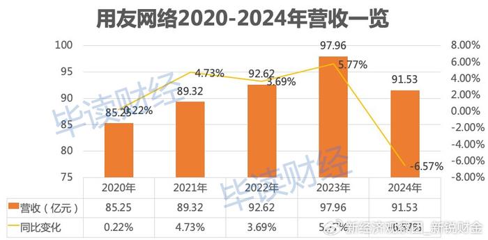 而这样的下滑态势此后仍未好转,甚至在2023年后由盈转亏。2023年,用友实现营收97.96亿元,同比增长5.77%;净亏损达到9.67亿元,同比大幅下滑541.28%。进入2024年,用友首次面临营收、净利双降局面,实现营收91.53亿元,同比下滑6.57%,净亏损幅度进一步扩大,达到20.61亿元,同比下滑113.13%。