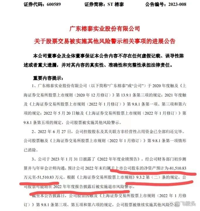 1: ST榕泰2022年报后净资产负,触及上交所《上市规则》9.3.1第二项。