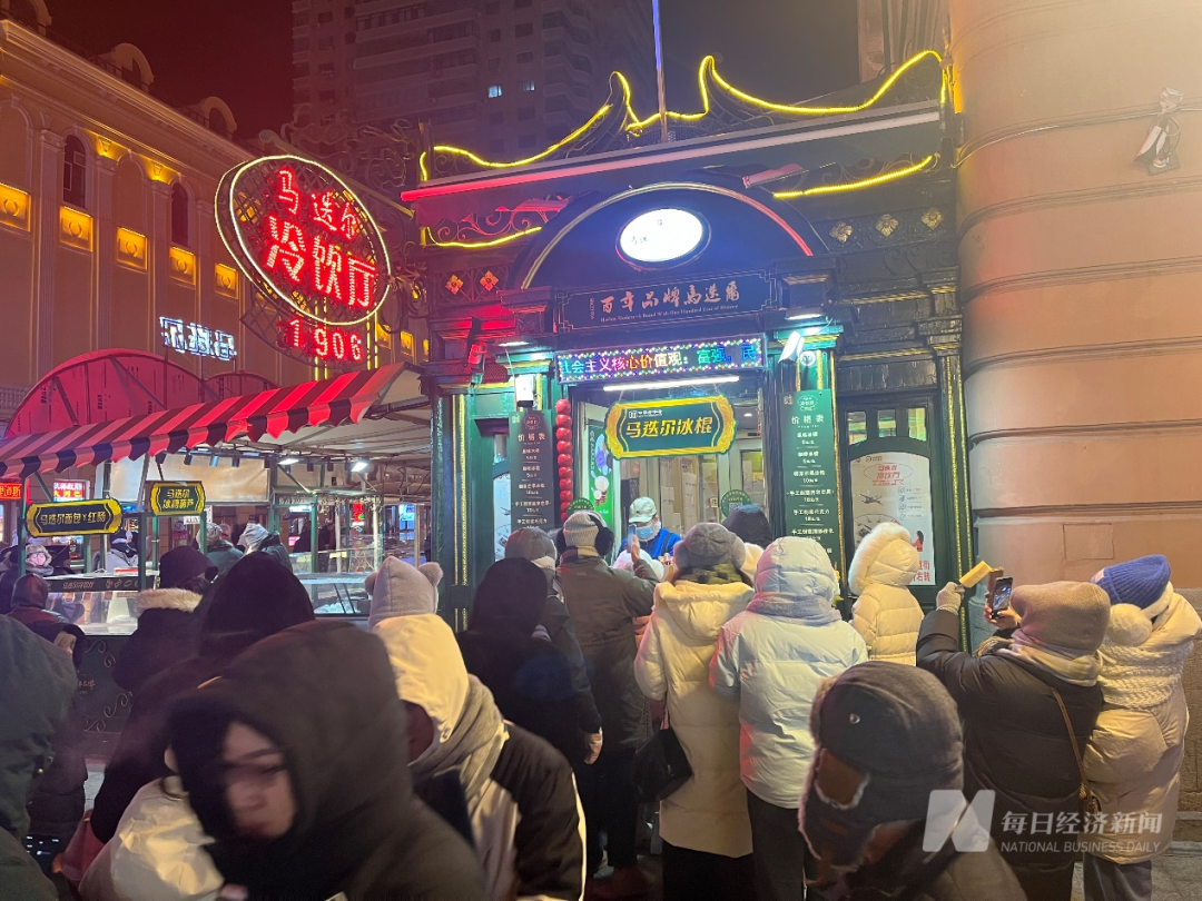 元旦前夕,《每日经济新闻》记者在哈尔滨中央大街上看到,零下30℃的寒冷天气,也挡不住游客打卡这条当地著名的旅游街道,马迭尔冰棍的售卖点前,排起了长长的队伍。不少买到了冰棍的游客高高举起冰棍,拍照留念。一位来自广东的游客说,来了哈尔滨,怎么能不吃一根马迭尔冰棍呢?