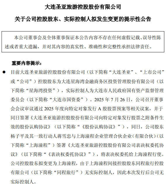 本次发行前,公司控股股东为星海湾投资,实际控制人为大连市国资委。通过实施上述定增及表决权委托事项,上海潼程将合计控制公司51,702,532股股票,拥有的表决权股份数占本次发行后公司总股本的30.88%,上海潼程将成为公司控股股东,由于上海潼程的间接控股股东同程旅行无实际控制人,因此本次发行后公司无实际控制人。