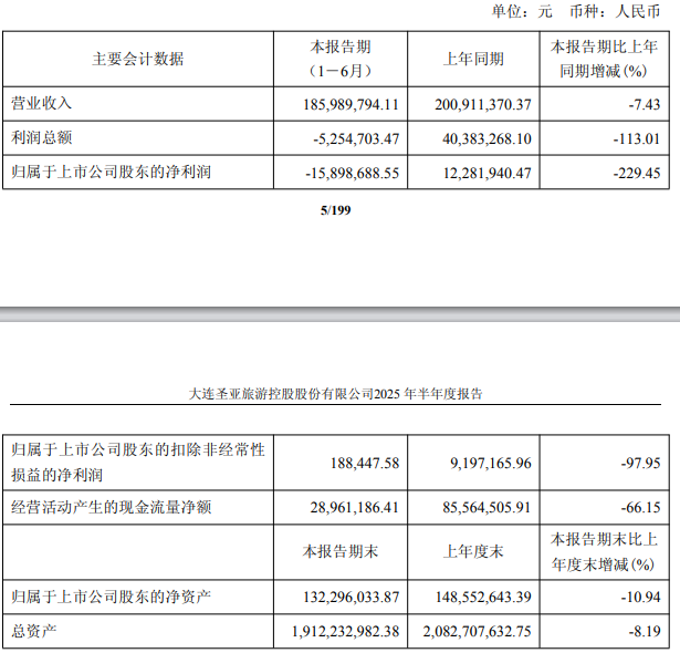 8月19日晚,大连圣亚发布2025年半年报。上半年公司实现营收1.86亿元,同比减少7.43%;归母净利润亏损1589.87万元,同比减少229.45%,而上年同期为1228.19万元;实现扣非净利润18.84万元,同比大幅减少97.95%。