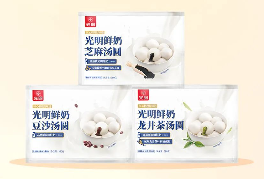 11月12日,光明乳业官宣推出新品:光明鲜奶龙井茶汤圆、芝麻汤圆、豆沙汤圆。