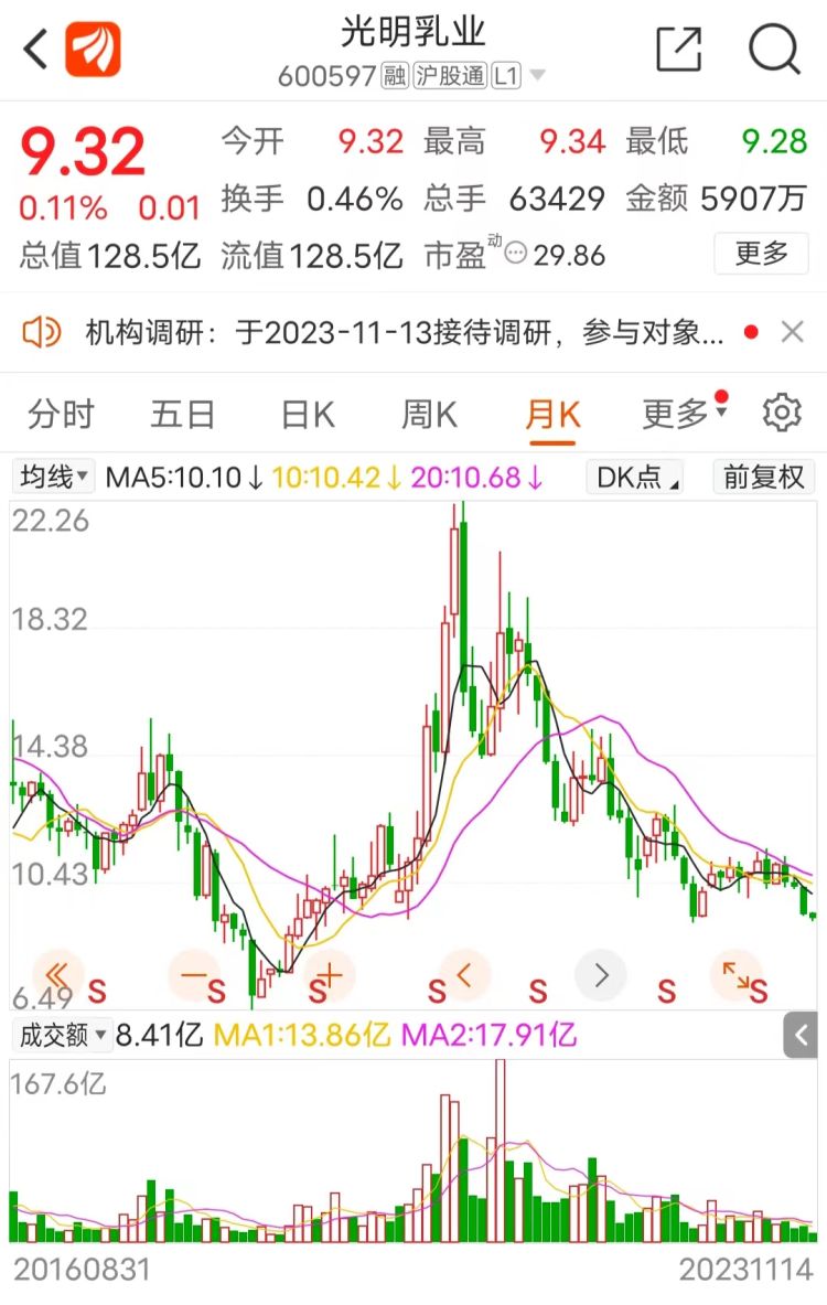 四季度有什么举措改善业绩?在业绩说明会上,光明乳业表示,四季度公司将从产业链各板块出发,推进高质量发展。牧业端:聚焦“牧场经营、种养循环、育种引领”三大重心开展工作。生产端:坚持“成本、奶源、产能”三个优化工作。渠道端:持续推进重点商超系统网点覆盖率提升目标。市场端:聚焦重点媒介、重点品牌和产品持续突破强化,进一步加强线下渠道与线上传播整合。海外端:新莱特未来仍将聚焦营养品核心主业,大力发展中标婴配粉业务。