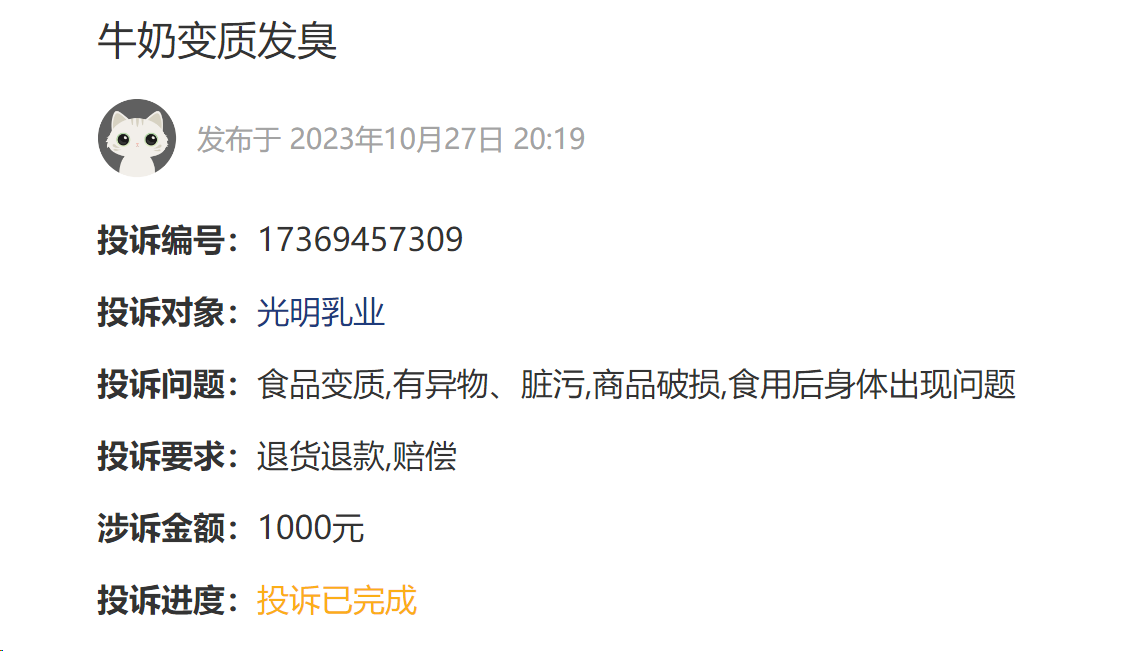 此外,截至2023年11月15日,在黑猫投诉平台上,含有光明乳业词条的投诉量达361条,光明乳业的投诉量为337起,已完成量为309起。