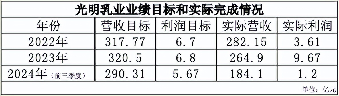 2024年光明乳业的业绩目标是290.31亿元,利润为5.67亿元,前三季度,光明乳业营收达成184.1亿元,利润1.2亿元,恐怕也难以完成了。