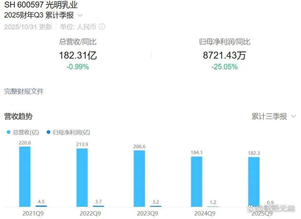 2025年三季报显示:光明前三季度营收182.3亿元,同比下滑0.99%;归母净利润仅8721万元,暴跌25.05%;第三季度更是净亏1.3亿元——这已是连续第三年营收下滑。
