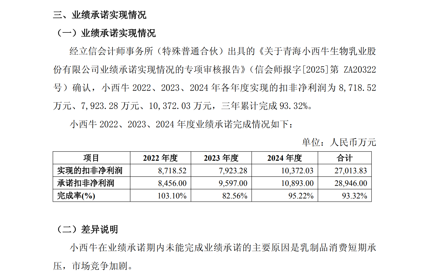 收购后, 小西牛 仅在2022年完成了业绩承诺,之后两年全部“失约”。2022年-2024年, 小西牛 实现的扣非净利润为8719万元、7923万元、1亿元,三年累计完成93.32%。
