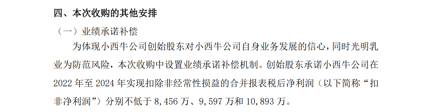 为体现 小西牛 创始股东(王维生、张玉琴)对 小西牛 自身业务发展的信心,同时 光明乳业 为防范风险,收购中设置业绩承诺条款:创始股东承诺 小西牛 在2022年至2024年实现扣除非经常性损益的合并报表税后净利润即扣非净利润分别不低于8456万元、9597万元和1.1亿元。
