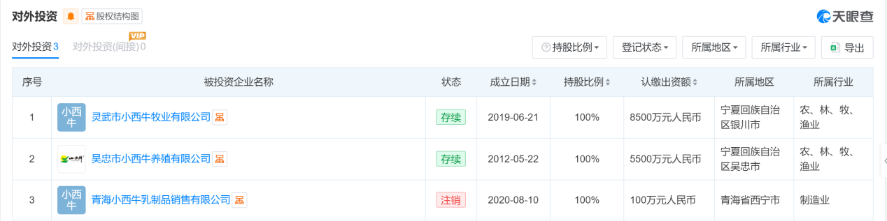 奇怪的是,在收购剩余40%股份的公告中, 光明乳业 称 小西牛 有三家全资子公司。除了上述两家以养殖为主的公司外,还有位于青海的 青海 小西牛 乳制品销售有限公司 。 资料 显示,这家公司2020年8月就已经注销了。