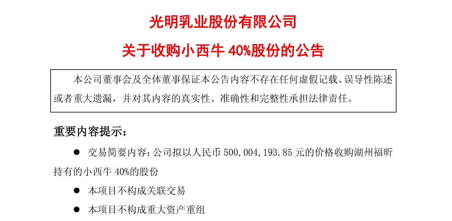 11月29日, 光明乳业 发布公告,公司计划以5亿元收购 湖州福昕创业投资合伙企业 (有限合伙)(下称“湖州福昕”)持有的 小西牛 40%股份。按照收购估值, 小西牛 的身价达到12.5亿元。