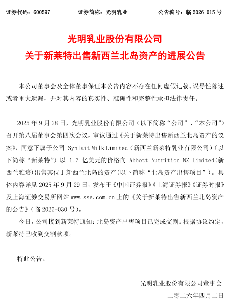 4 月 3 日,光明乳业(600597)发布公告,旗下新西兰子公司新莱特乳业(Synlait Milk)已完成北岛资产出售交割,以1.7 亿美元(约 12.1 亿元人民币) 价格将相关资产转让给新西兰雅培(Abbott Nutrition NZ Limited),并已全额收到交易款项。这是光明乳业在 2025 年首现年度亏损后,海外业务“止血瘦身”的关键一步。