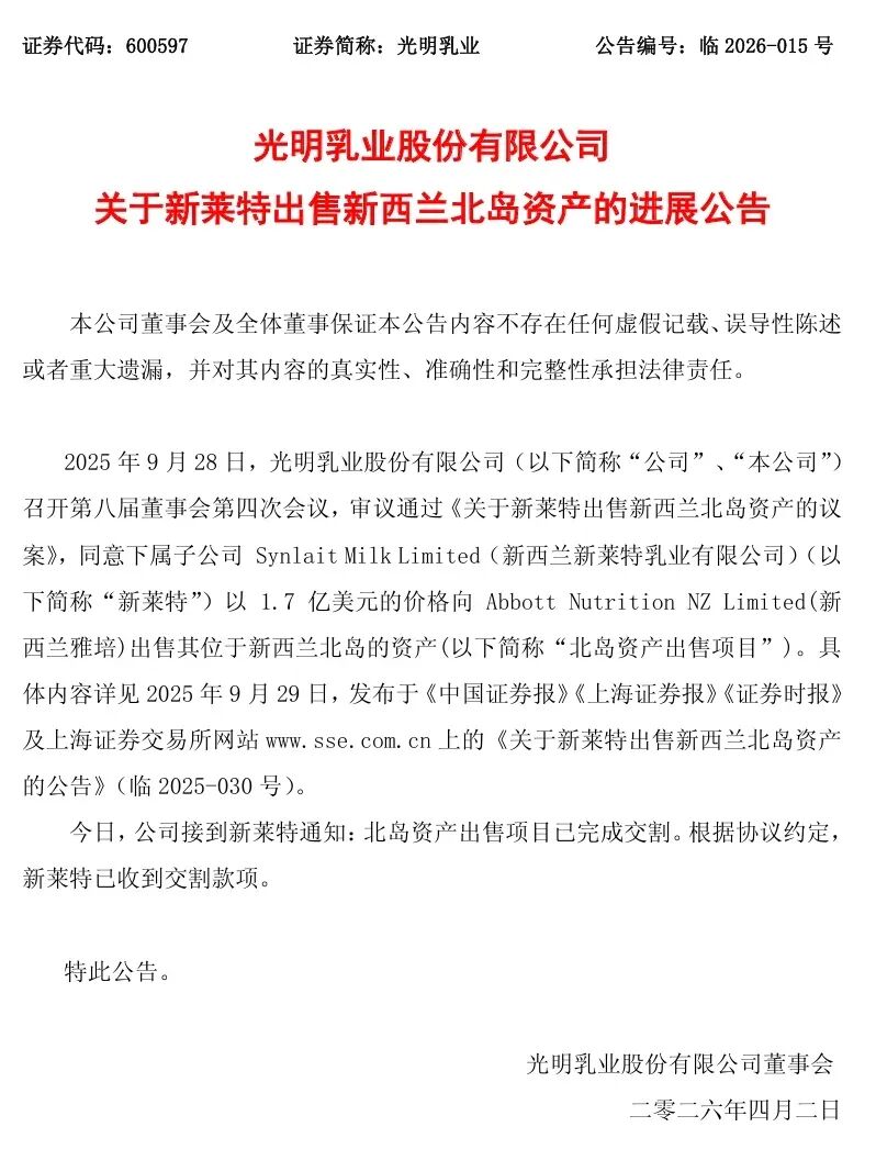 眼看海外窟窿越捅越大,光明终于下了决心:割肉。今年4月初,光明公告,已将新莱特旗下位于新西兰北岛的一座营养粉工厂及相关资产,作价1.7亿美元(约12.1亿人民币)卖给了美国巨头雅培。这笔买卖,被市场普遍解读为“止损求生”。