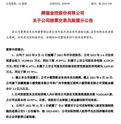 对有关事项和风险,ST熊猫称,公司于2023年8月31日披露了2023年半年度报告,公司2023年1-6月份实现营业收入15,588.61万元,同比下降35.09%;归属于上市公司股东净利润4,129.29万元,同比下降41.07%;归属于上市公司股东的扣除非经常性损益的净利润为3,639.03万元,同比下降47.75%。