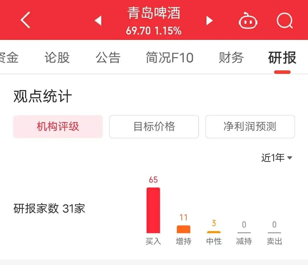 根据同花顺的数据,最近1年,有多达31家机构对青岛啤酒发布过研报。其中买入评级有65份,增持评级11份,中性评级只有3份,没有减持和卖出评级。
