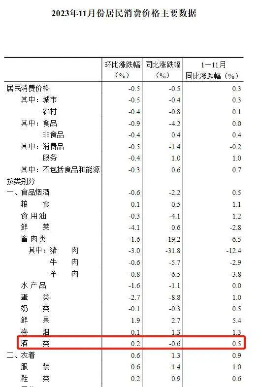 另据国家统计局数据,2023年11月份,食品烟酒类价格同比下降2.2%,影响CPI(居民消费价格指数)下降约0.64个百分点。具体到酒类产品,11月同比下跌了0.6%。