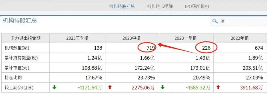 到了2023年第二季度,结合前文所属的券商机构集体唱多,不但唱多还上调目标价的“呐喊”,不少机构第二季度“加仓了”。本季度持股机构数量从226家暴增到719家,累计持股量也增长到了1.66亿股,持仓比例增长到了23.7%。但在第二季度,股价已经开始下跌,毫无疑问,这部分新进的机构是比较惨的,基本上买入后就一直亏。