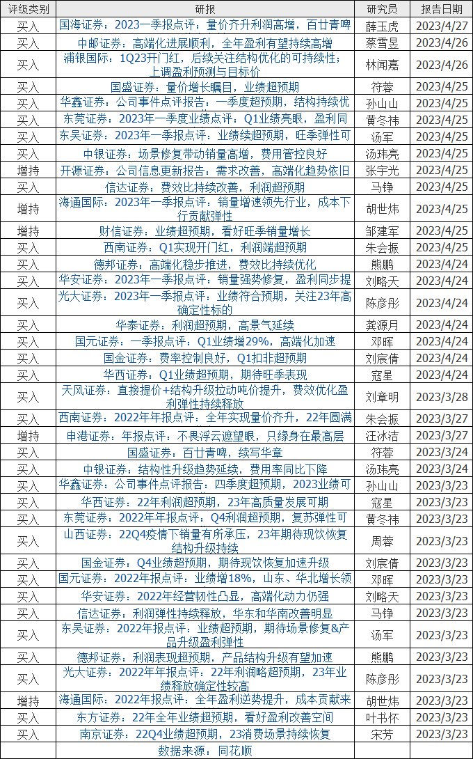 尤其是2023年3月-4月,青岛啤酒发布年报前后,且股价创出历史新高之际,大量券商“扎堆”唱多。