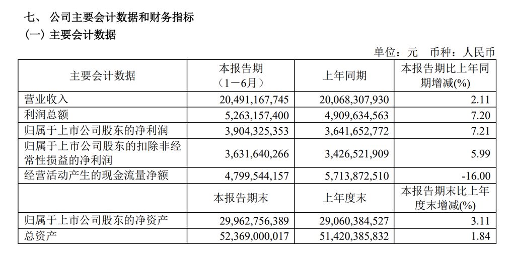 财报显示,今年上半年公司实现营收约204.91亿元,同比增长2.11%;归属于上市公司股东的净利润则增长7.21%至39.04亿元。