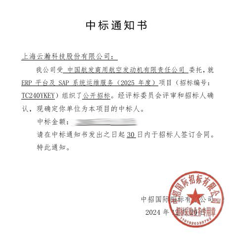 近日,云赛智联旗下企业上海云瀚科技股份有限公司中标了中国航发商用航空发动机有限责任公司2025年度ERP平台及SAP系统运维服务项目。这是云瀚科技继中标中国商飞上海飞机设计研究院试验专网网络安全系统项目、AI智能运行环境项目之后,在航空航天信息化领域再次迈出坚实的一步。