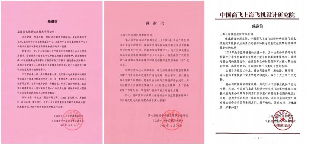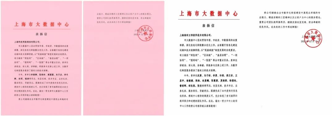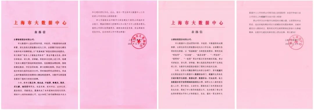 岁末年初,云赛智联股份有限公司及所属企业陆续收到了来自上海市大数据中心、上海市体育局、上海市财政局、上海市审计局、上海市公安局、上海市市场监管局、中共上海市委组织部、上海市中小企业发展服务中心、上海市徐汇区数据局、上海市闵行区数据局、上海市奉贤区审计局、中国商飞上海飞机设计研究院等众多客户发来的感谢信和表扬信,体现了云赛智联及所属企业在城市数字化转型领域所具备的专业能力、优质服务和敬业作风。