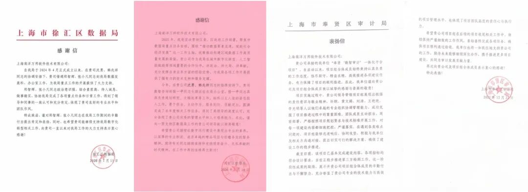 上海市大数据中心、上海市体育宣教中心、中共上海市委组织部办公室、上海市徐汇区数据局等客户纷纷来信,分别对云赛智联在支撑全市政务人工智能应用体系建设、服务区域数字化转型重点任务、赋能徐汇区数据创新实验室建设中的专业能力和积极贡献,给予了充分肯定与高度评价。