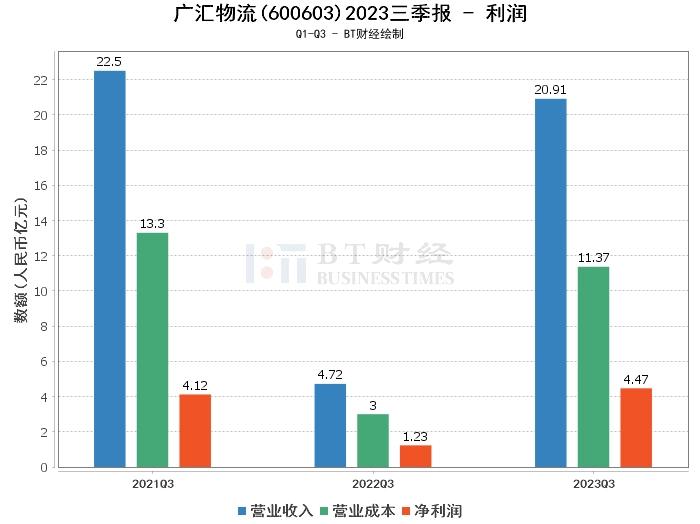 在利润方面,广汇物流2023年三季度的营业收入为20.91亿元,较上年同期的12.63亿元有显著增长。营业利润为5.71亿元,较上年同期的2.93亿元有所提升。营业成本为11.37亿元,相较于上年同期的7.81亿元有所增加。净利润为4.47亿元,较上年同期的2.37亿元有显著增长。