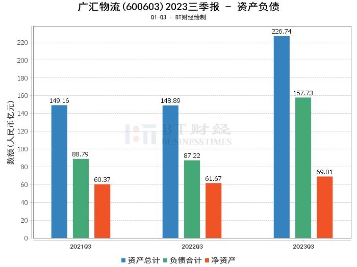 在资产负债方面,广汇物流2023年三季度的总资产为226.74亿元,相较于上年度末的217.07亿元有所增长。负债合计为157.73亿元,相比上年度末的152.96亿元也有所上升。净资产为69.01亿元,较上年度末的64.1亿元有所提升。资产负债率为69.57%,相较于上年度末的70.47%有所下降。
