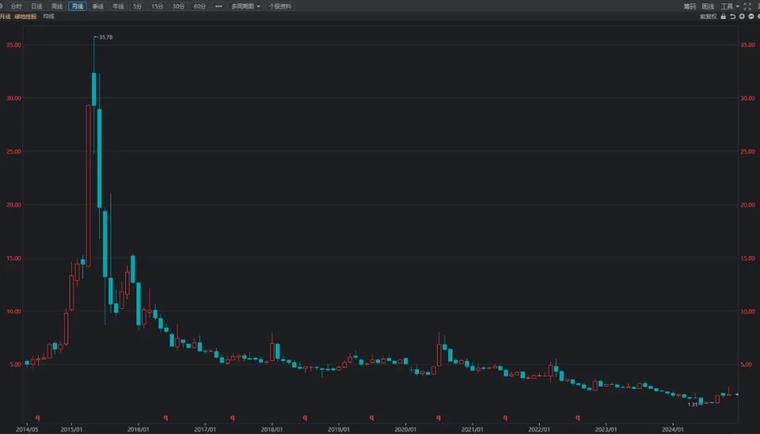 上市当初,绿地控股风光无两,股价曾大幅攀升。但如今已经泥牛入海,股价较2015年的高点大跌95%左右。