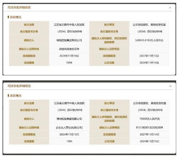 屋漏偏逢连夜雨。刚刚过去的11月14日~15日,绿地控股旗下南京绿地地铁五号线项目投资公司、泸州绿地酒业的股权被冻结,数额合计约60亿元,冻结期限长达3年。