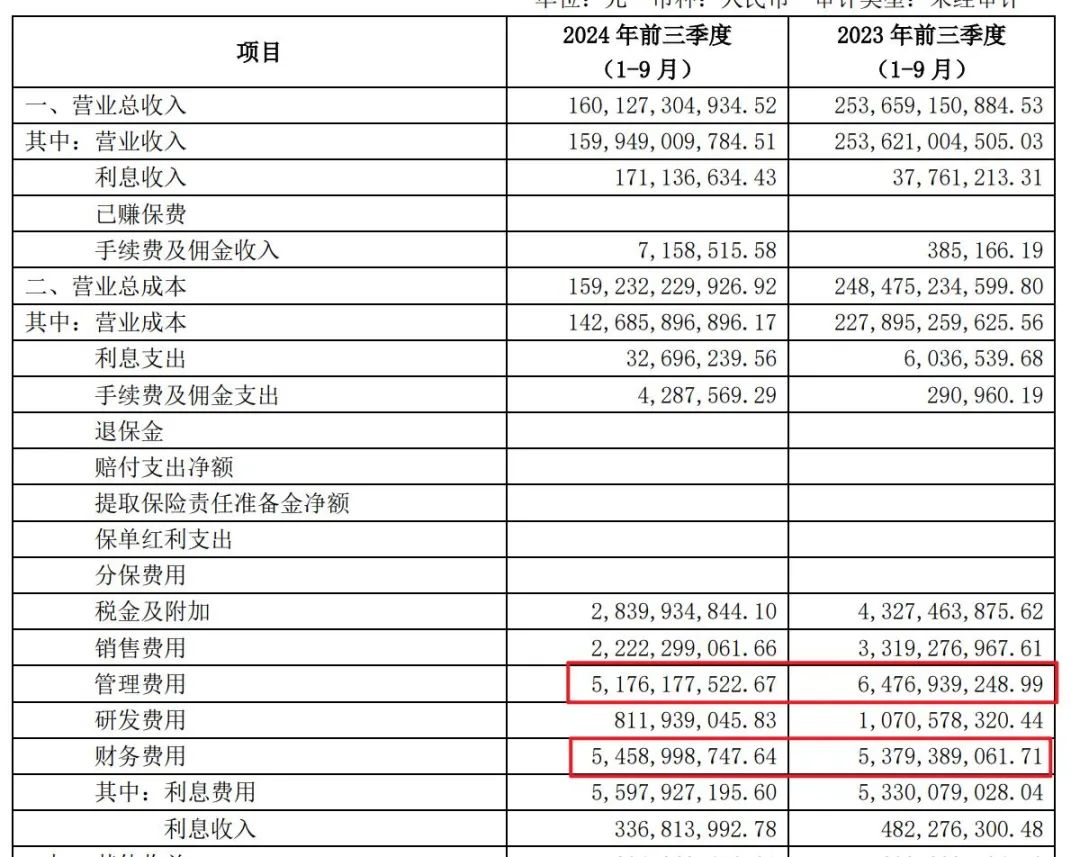 绿地控股今年前三季度营收同比下滑约37%,与之相较,管理费用和财务费用却没有同步下滑,导致归母净利润大幅下滑90%,远超营收下滑速度。