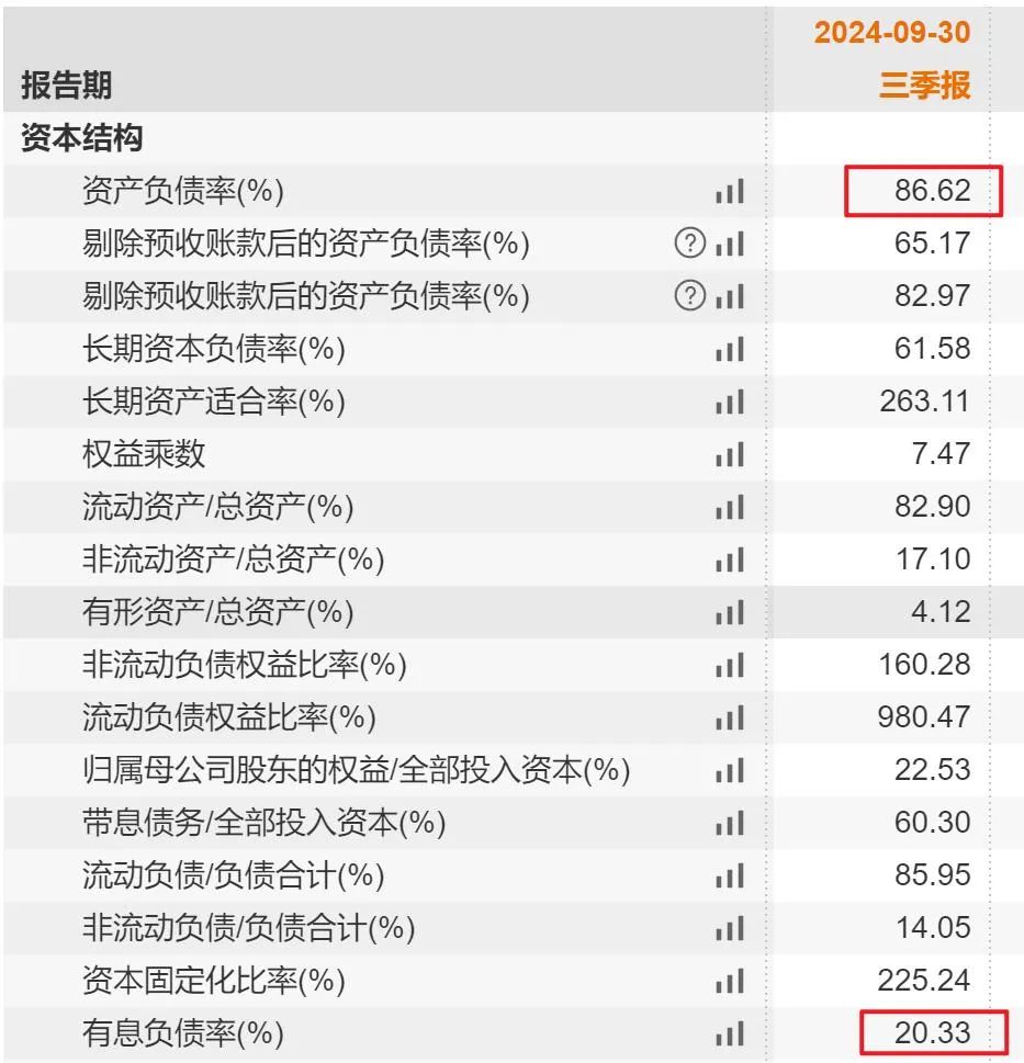 此外,绿地控股负债率也明显高企。截至2024年9月末,公司资产负债率超过86%,高于行业平均水平。